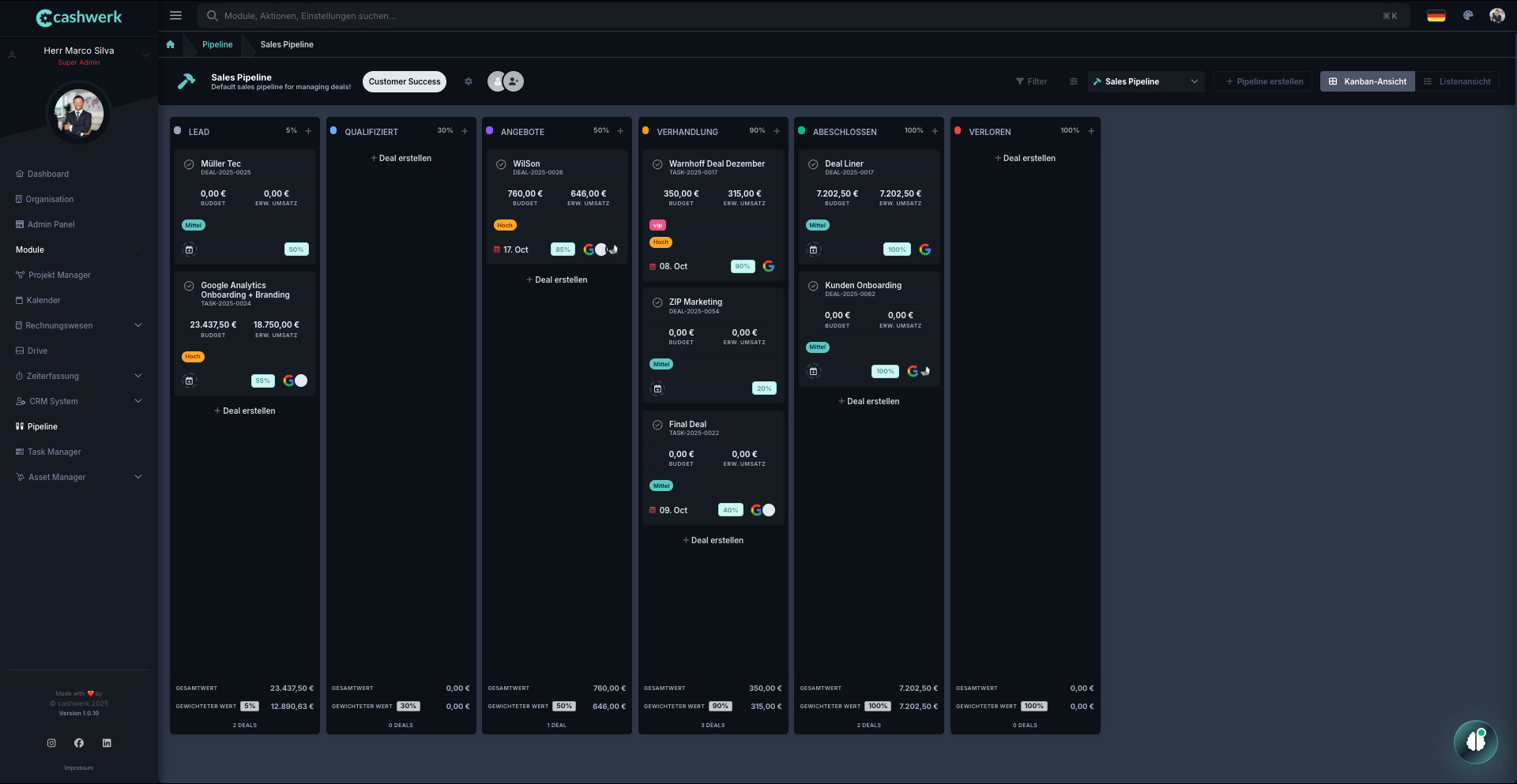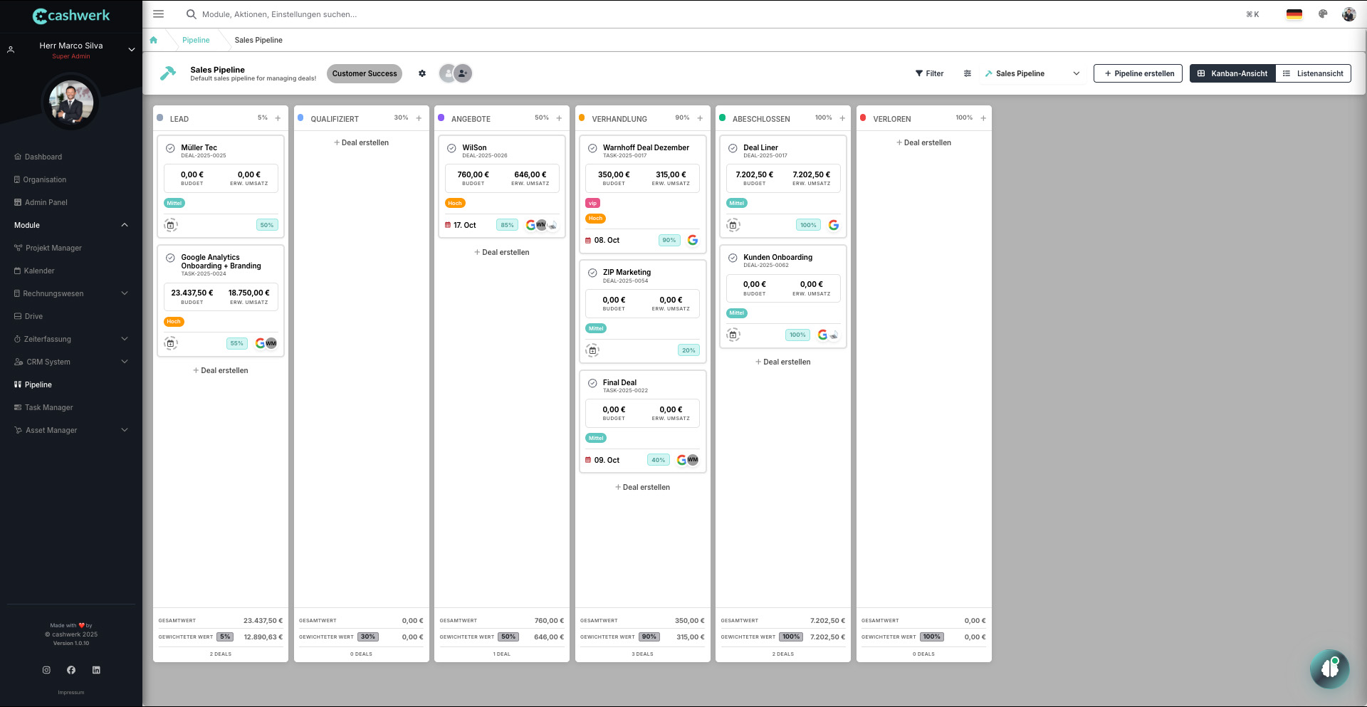 cashwerk ist die All-in-One Plattform, die alle Deine Geschäftsprozesse in einer einzigen, intelligenten Lösung bündelt. Schaffe Transparenz, verbessere die Team-Zusammenarbeit und triff datengesteuerte Entscheidungen. Nutze Dein volles Potenzial, statt dich im Chaos zu verlieren.